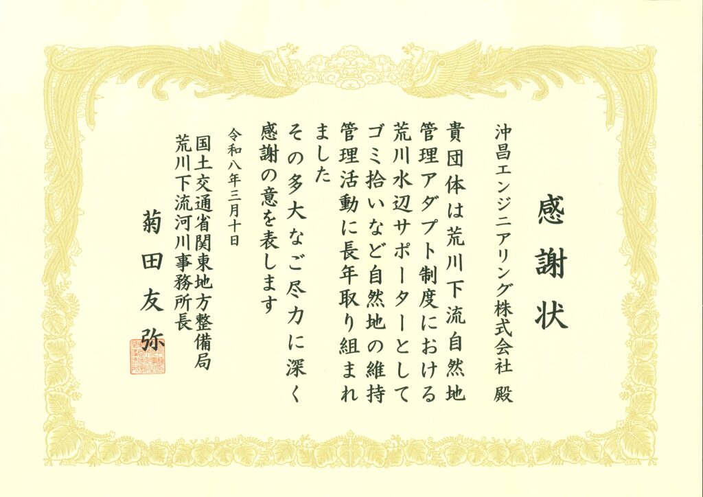 平成28年12月10日に第1回荒川水辺サポーターとして地域社会貢献活動に取り組んできたことに対して令和8年3月9日、関東地方整備局荒川下流河川事務所より、活動10年の節目として感謝状を贈呈されました。荒川下流部の定期的な清掃活動を通じて河川が常に安全・安心・快適な状態に保たれるよう、今後も継続して活動を続けていきます。